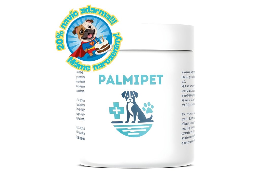 Díky své vysoké stravitelnosti, podpoře imunitního systému, zdraví kůže a srsti, srdce a kloubů, stejně jako celkové nutriční podpoře, může být edestin cenným přídavkem do stravy psů. V kombinaci s přírodní látkou Palmitoyletanolamid (PEA), která je studována pro její protizánětlivé a bolest tlumící účinky, vzniká inovativní doplněk stravy PALMIPET, který může poskytovat celkovou podporu zdraví a regeneraci psů![Palmipet představení]()
